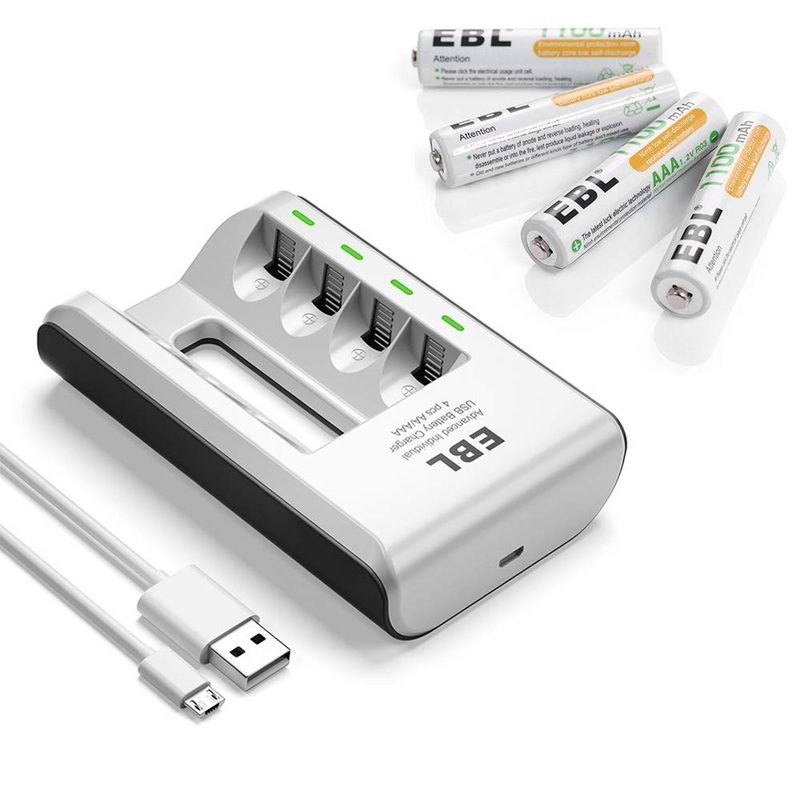 EBL 807 4-Bay AA and AAA Battery Charger with Built-In LED Charge Status Indicator Lights and 4pcs 1.2V AAA 1100mA Rechargeable NiMH Batteries for Portable and Emergency Electronics